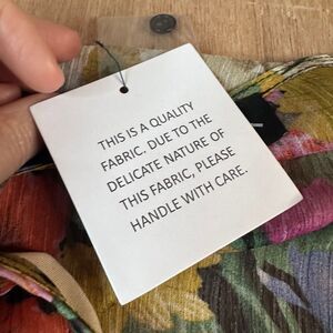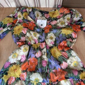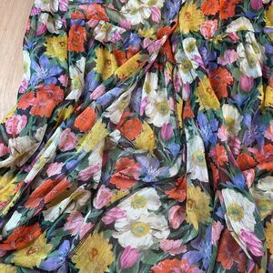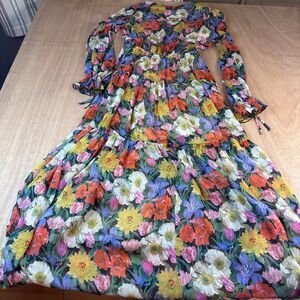 Gorgeous Aakaa women’s maxi dress in size XS, featuring a romantic fall floral print in rich shades of orange, mustard, cream, lilac, and green. Made of lightweight, semi-sheer chiffon-style fabric with beautiful flow and movement.