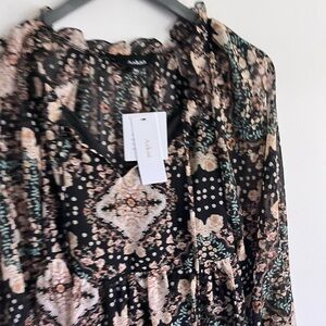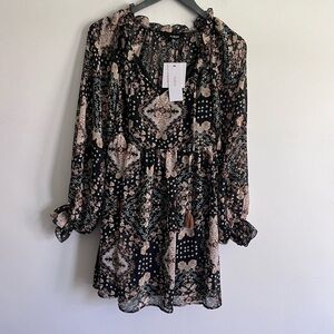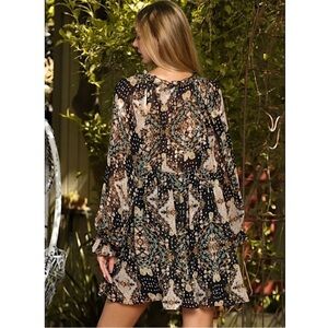 boho mini dress, Aakaa dress, festival outfit, fall dress, floral print dress, romantic style, long sleeve mini dress, vacation outfit, flowy bohemian dress, Aakaa black dress, date night dress, western chic, feminine fashion, XS boho dress