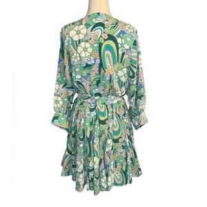 Step into casual elegance with this Aakaa mini dress, featuring a vibrant green and white floral pattern that screams retro. The dress boasts long bishop sleeves and a v-neck, making it perfect for resort wear or a beachy vacation. Matching sash and stretch waist. Its lightweight fabric and relaxed fit ensure comfort and style for warm weather outings.