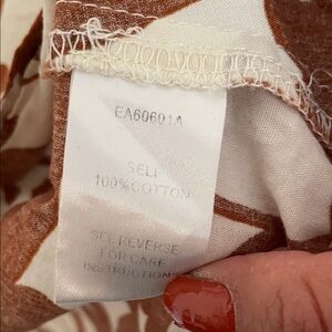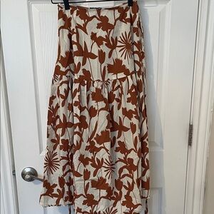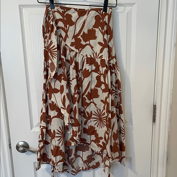Chic high-low skirt by Aakaa. Features a floral pattern in brown and cream. Ideal for versatile styling. Wrap style skirt. Size Medium. Excellent used condition. Waist: 12.5 inches. Smoke free and pet friendly home.