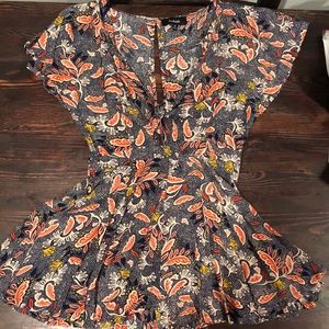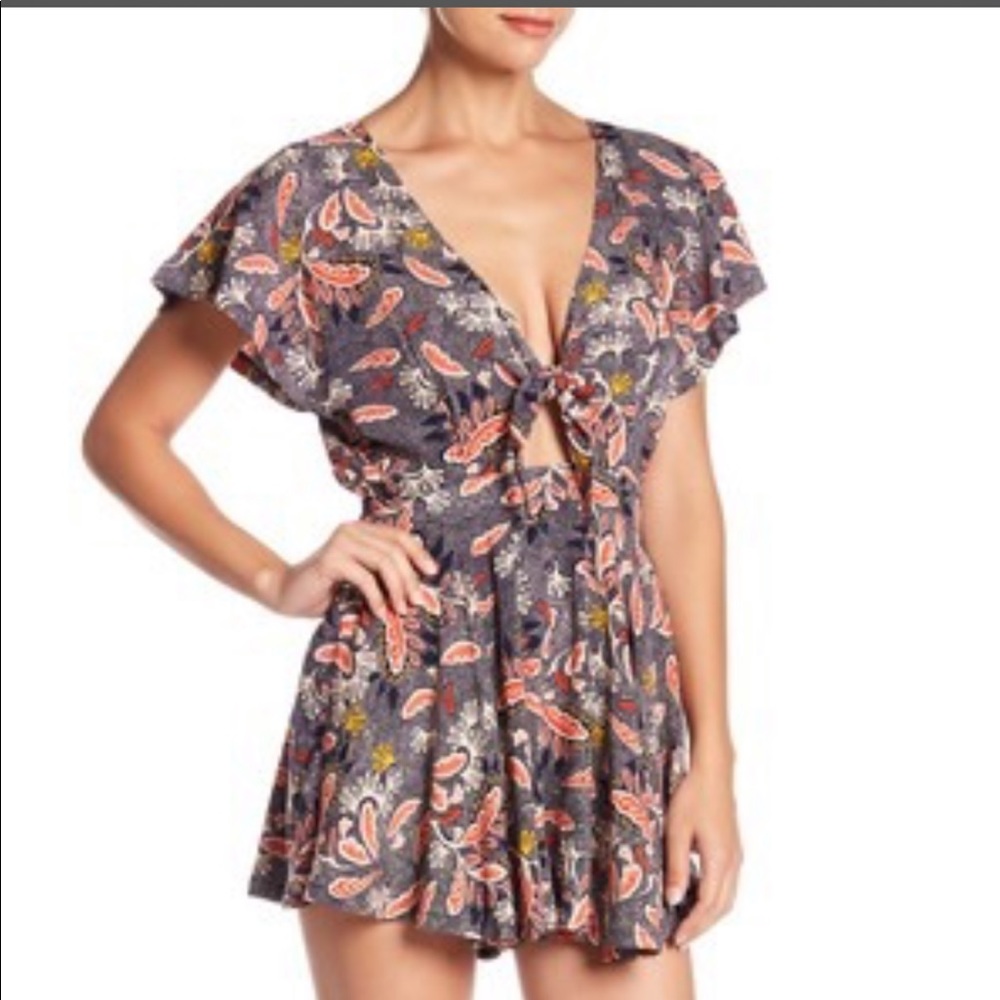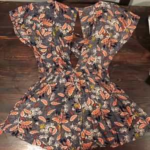 Navy romper with orange and yellow designs , cinched waist and short. Size medium and only worn once.