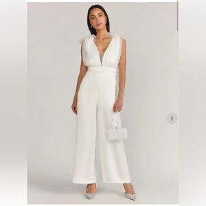 bridal jumpsuit, rehearsal dinner outfit, white one piece, wide leg jumpsuit, Aakaa clothing, wedding shower outfit, bride to be look, statement jumpsuit, modern bridal style