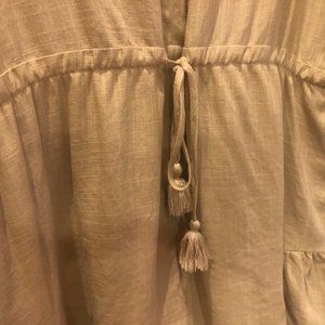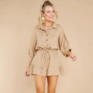 Adorable ruffle feature on bottom of shorts. Drawstring tie waist and front button enclosure with collar.