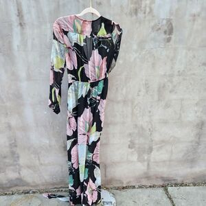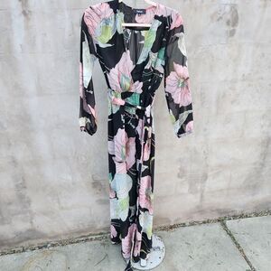 art deco floral print sheer/semi sheer belted with elastic waist faux wrap dress. Preloved condition. All sections of interest as well any known flaws have been documented in the photos and noted as thoroughly as possible. if there are no known flaws, none will be noted. Please feel free to ask any questions before purchase 🙂.