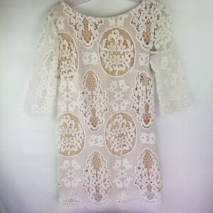 Very cute embroidered/ crochet look tunic. Its is lined with a tan lining. In picture 8 is a swoop neckline with is actually the back of tunic. Cute with leggings and boots. Approximate measurements are pit to pit 16". Sleeves are 14". Length is