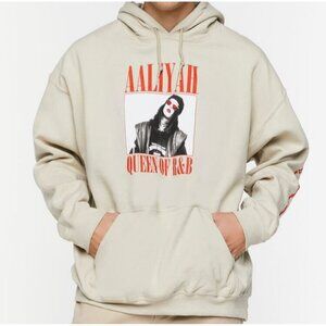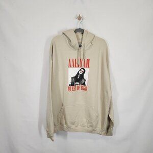 A knit hoodie featuring front "Aaliyah Queen Of R&B" text and matching graphic