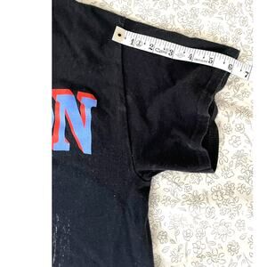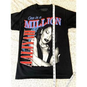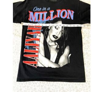 Black short sleeve Aaliyah t-shirt featuring bold “One in a Million” text with large front portrait graphic. Official licensed merch, size Small. Soft cotton with a classic crew neckline. Perfect for fans of 90s R&B and streetwear style.