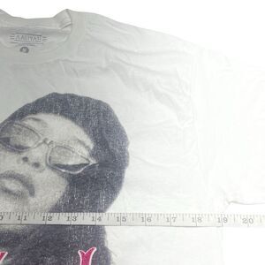 Features and details: minimal stretch, crew neckline, short sleeves, distressed design, pick glitter wording, Aaliyah graphic on front only
