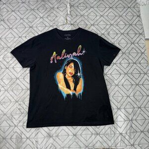 The product is a vintage 90s Aaliyah retro spray paint style black T-shirt by the brand Style. The shirt is a regular fit size XL for men, featuring a bold 90s theme in a classic black color. Perfect for those who appreciate retro fashion and iconic styles from the 90s era, this T-shirt is a standout piece for any wardrobe.
