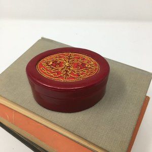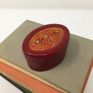 - Rich red, oval, leather box with intricate gold, red, and sequin embroidery top, and a black suede bottom
