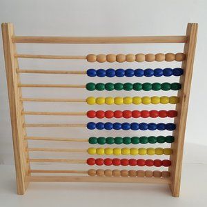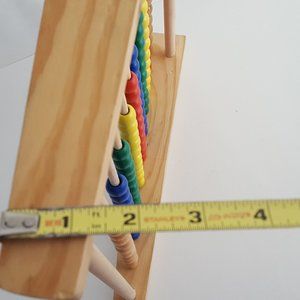 Pre-owned, in good condition. Slight warp in one of the dowels (green beads) See photo. Some color transfer onto dowels (blue). A few small dents in wood. Approximately 14.5"H x 14"W x 2.5"D.