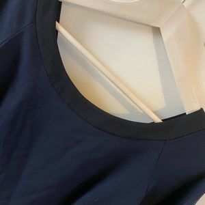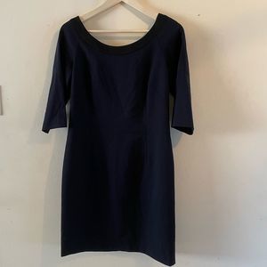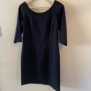 This stunning dress features darting, rounded scoop neck, contrast black trim at neckline, lined, darting to ensure a tailored fit, slight slit in back, quarter length sleeves and dramatic back zipper. Made of 53% polyester, 44% wool, 3% elastane. Lining: 100% polyester. Made in the USA. Model shots are to show fit. I no longer have the all black dress available. The dress you are purchasing is navy with black trim.