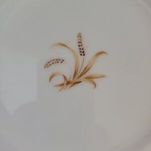 This vintage bread plate features a charming wheat pattern with gold trim, crafted by Taylor Smith Taylor. Ideal for collectors or elegant table settings.