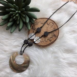 Large Mother of pearl pendant on a black leather necklace with coordinating black beads.