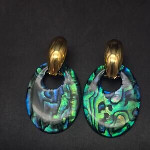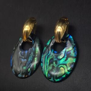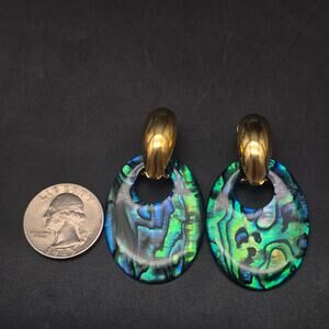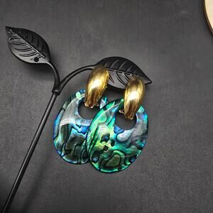 These vintage earrings are for pierced ears and feature abalone paua shell discs hanging from gold tone earrings and measure 2" x 1.2"