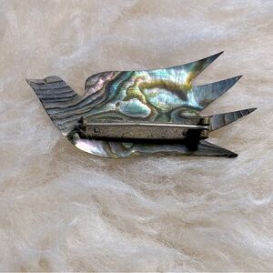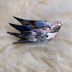 This gorgeous brooch is carved from abalone shell shaped like a bird and glimmers so colorfully.