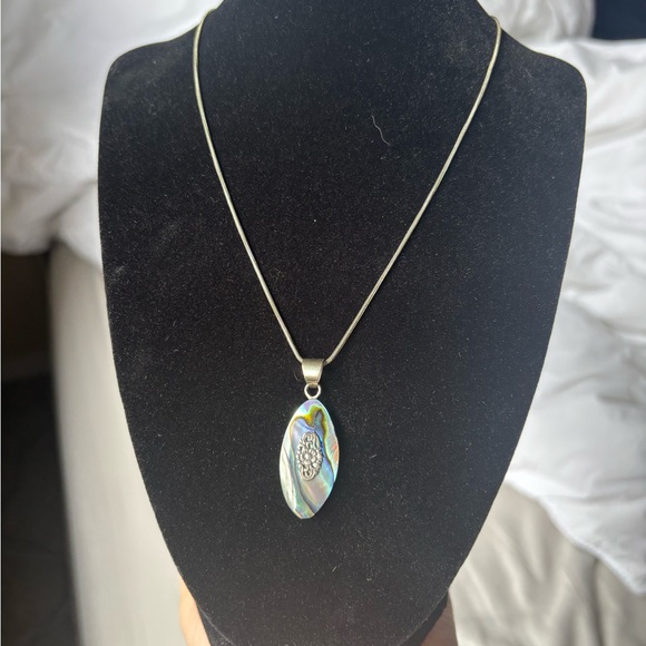 This stunning necklace features an elegant abalone shell sterling silver pendant, showcasing a beautiful array of colors. Perfect for adding a touch of sophistication to any outfit.