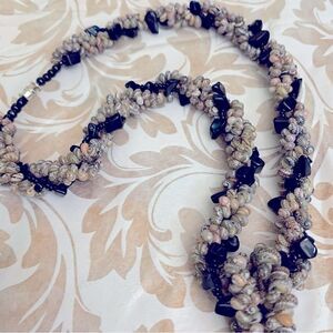 Vintage Boho Abalone Shell Pendant Necklace 18” Baby Shells - Seed Beads - Black Stone Also Bracelet 8” Gorgeous