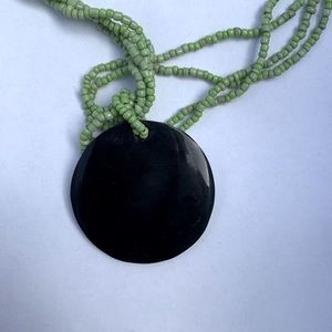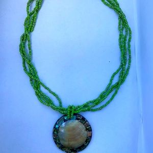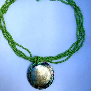 Mother of Pearl Abalone pendant with 4 green strands and loop enclosure.