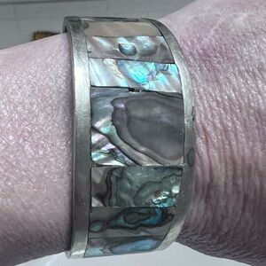 Stunning bracelet with abalone shell inlay. Features a silver band. Unique and eye-catching design.