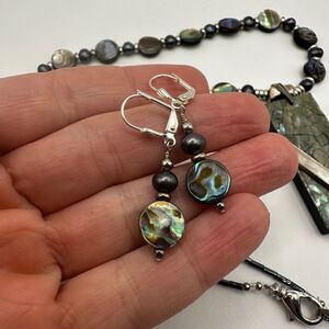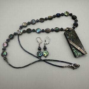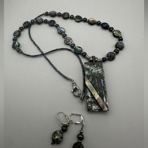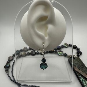 23” long abalone shell and silver/navy blue beaded necklace with silver tone lobster clasp.