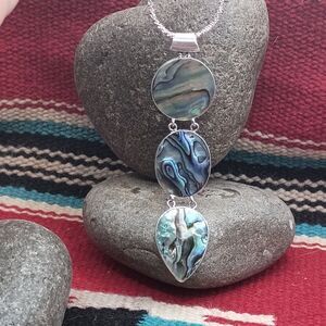 Abalone Shell Pendant Drop Necklace Triple Teardrop Circle Design Chain Sterling