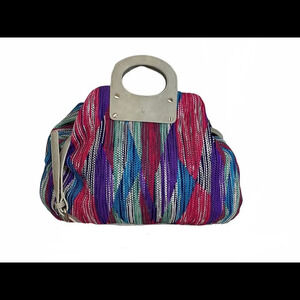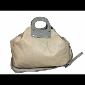 Two bags in one! A fantastic reversible bag. One side has a striking geometric pattern, and the other a soft, faux leather fabric in a pretty soft cream. This soft slouchy handbag is so roomy and comfy to carry. Detachable shoulder strap. Measurements: 18 x 13.5 x 2” good used condition with light dirt wear on the light side and some minimal peeling.