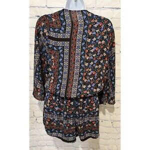 The Abeline Floral Paisley Print Shorts Romper in size small is a stylish and versatile piece perfect for casual occasions or travel. Made from polyester, this one-piece outfit features a V-neck and 3/4 sleeves, with a colorful multicolor floral pattern ideal for the bohemian theme. The romper is designed in a way that is comfortable for all-day wear during the summer, fall, or spring seasons, making it a must-have addition to any woman's wardrobe. 18 inches pit to pit and 30 inches long. Smoke free home.