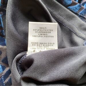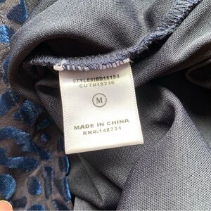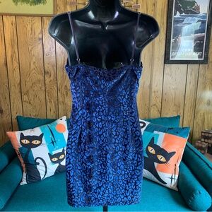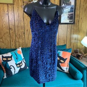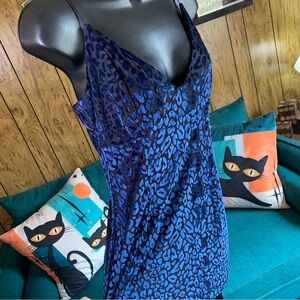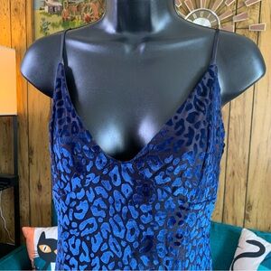 Elegant royal blue lingerie chemise style dress with royal blue leopard velvet burnout pattern.