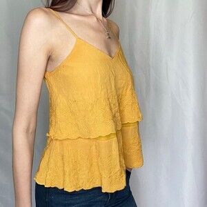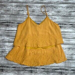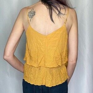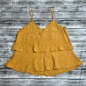 Abbeline Tiered Floral Embroidered Light Tank Top XS Extra Small Mustard Yellow
