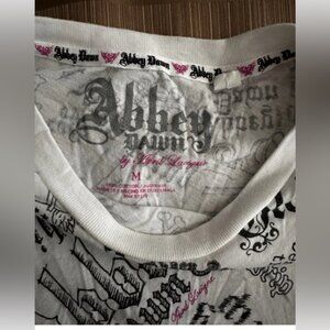 This vintage Abbey Dawn Avril Lavigne Skull and Crossbones Like New size medium T-shirt is a stylish piece of women's clothing from the 2000s. The punk-inspired design features a bold skull motif on the chest, perfect for those who love edgy and alternative fashion.