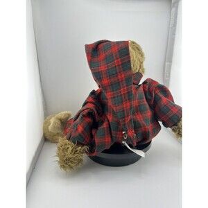 This product is a Charlie Bears plush teddy bear in beige color, dressed in plaid pajamas and bunny rabbit slippers. It is a Christmas-themed bear that can be used as lodge cabin decor.