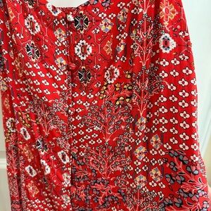Red handkerchief bandanna printed midi dress with functional button front detail. Has a cutout elastic band in back of dress and ruffled high low hem. Dress is partially lined and has adjustable spaghetti straps. Made of 100% rayon, machine washable.