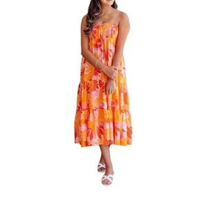 The Abel The Label Strapless Midi Dress in Women's size Small features a vibrant small floral pattern in pink, orange, and red hues. The dress has a pullover closure, sleeveless design, and is made from machine washable rayon fabric. Perfect for occasions like travel, parties, or casual outings, this dress is a stylish choice for the summer, fall, and spring seasons. The smocked detailing adds a touch of charm to the A-line silhouette, making it a versatile and fashionable option for women looking for a maxi or sundress style.