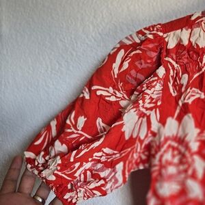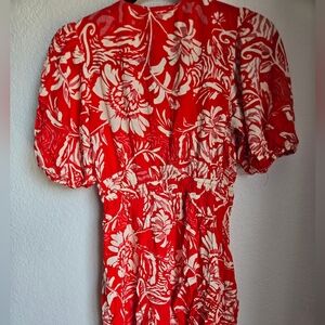 Vibrant Orange dress with white floral pattern. Features puff sleeves and a cinched waist.