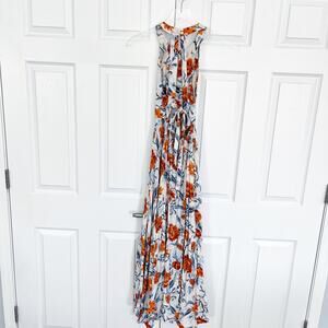 All-over floral print. High neck with button neck details. Tie-back. Lattice inserts. Smocked waist. Unlined. Front vent. Asymmetrical hem.