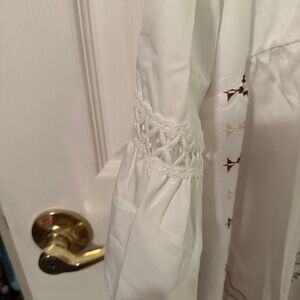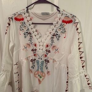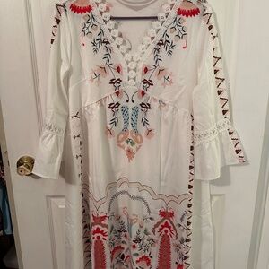 Abela Story + Co. Size L. Polyester. White lace trimmed V neck mini dress. Mid length sleeves with an open work design. Pops of red, pink, brown, and blue.
