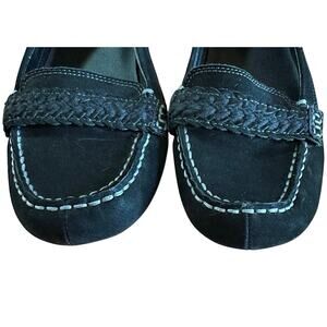 These Abella “Glena” loafers feature a black suede leather upper with a braided strap detail, contrast stitching, and a modern square toe. The slip-on design, flexible rubber sole, and cushioned insoles make them perfect for all-day wear, whether you’re headed to the office or running errands.