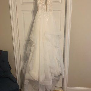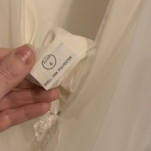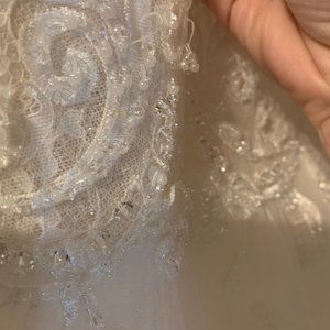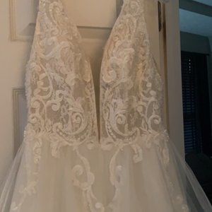 Stunning sample size 6 (too small for my size 10 frame) from boutique sale with plunging neckline and mesh insert. Detailed beading throughout bodice and appliques on the top portion of the gown . Has minor wear from try-ons-see photos for slight detached beading that can be easily repaired. Padded cups sewn in. There are no tags on this dress with the exception of the sizing tag but is the Louise by Abella E121.