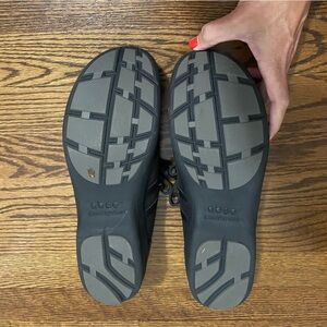 These are Abeo biomechanical black double strap, velcro shoes. They are leather trimmed at the toe and the heel. They have incredible foot support and are a size 10.