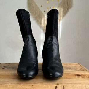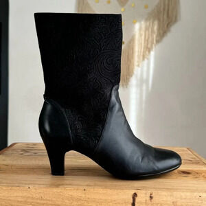 The Honest Heeled Boot From Abeo is constructed in buttery soft black Genuine Leather vamp and heel with black genuine suede leather tooled with embossed filigree floral print boot shaft and stripped fabric lining. They feature an elegant almond toe box, inner ankle zipper closure, cushioned insole, and orthotic rubber heeled bottom sole for comfort with your style in a just below the calf muscle silhouette. These are boho, whimsigoth, witchy, office, going out, timeless, artsy, modern goth vibes.