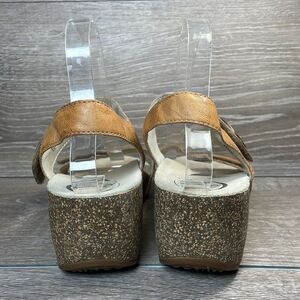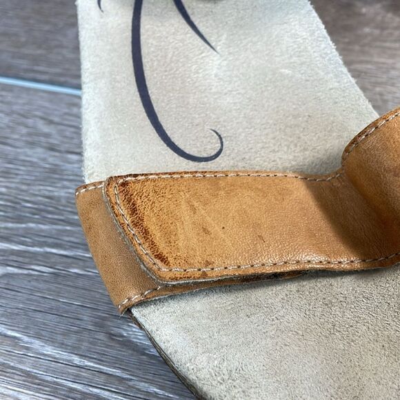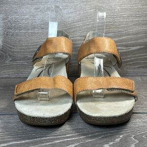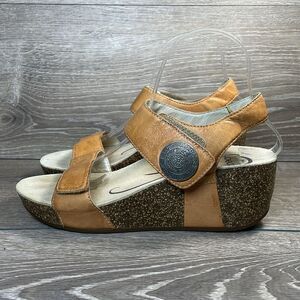 Abeo Una Tan Leather Women’s Sz 9N Alt Closure Circle Medallion Wedge Sandals
