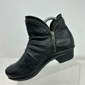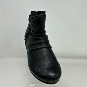Keywords: Abeo bootie, women's black boots, size 7 boots, leather booties, slip-resistant boots, ruched design boots, side zip closure boots, comfortable block heel, pre-owned women's boots, closed toe booties, women's leather footwear, stylish black booties, women's fall boots, Abeo leather booties, women's zip closure boots.