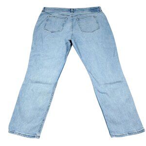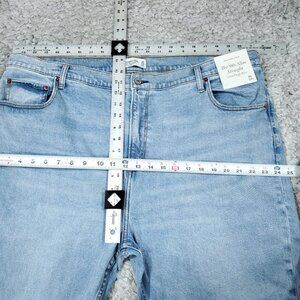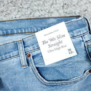 Abercrombie 90s Slim Straight Ultra High Rise jeans in light wash blue denim with slight stretch and slight distressing. The paper waistband tag is still attached as shown in photo, but the paper hang tag is missing. There is bleaching on the inside of the pocket as shown in photos, but it is not visible on the outside when worn. Women's plus size 22 or 36 short, real measurements shown in photos with jeans laid flat: