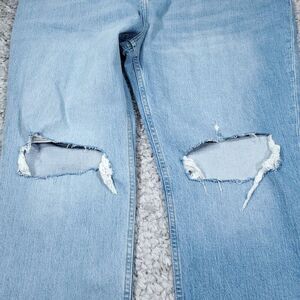 Women's Abercrombie 90s Straight Ultra High Rise Curve Love jeans in light wash blue denim with slight stretch. Ripped, distressed, destroyed, or busted knees. The paper waistband tag is still attached, but the paper hangtag is missing. There are no flaws on the jeans. Women's plus size 22 short or 36, real measurements shown in photos with jeans laid flat: