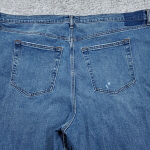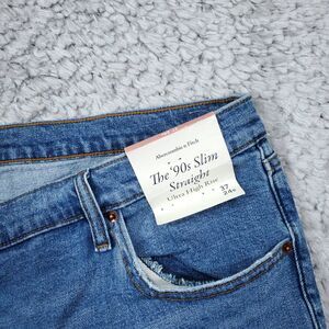Abercrombie 90s Slim Straight Ultra High Rise jeans in medium wash blue denim with slight stretch. Ripped, distressed, destroyed or busted knee. The paper waistband tag is still attached as shown in photo, but the paper hang tag is missing. There is a mark on the inside of the pocket as shown in photos. Women's plus size 24 or 37, real measurements shown in photos with jeans laid flat: