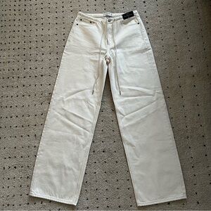A relaxed and ultra-loose jean with Curve Love fit for extra room in the hips and thighs. Featuring a low-rise waist and an adjustable drawstring, these jeans offer a laid-back, effortless vibe. The ecru wash adds a clean, modern touch, perfect for versatile styling.