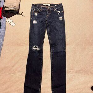 Abercrombie Erin jeans in size W26 L35. Dark wash with light distressing and the classic logo on the back pockets. Made with Perfect Stretch fabric for comfort that still holds its shape.