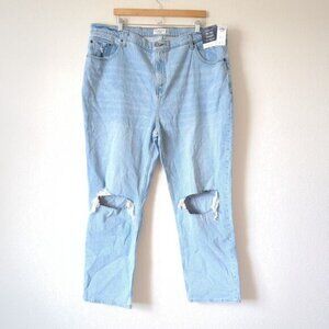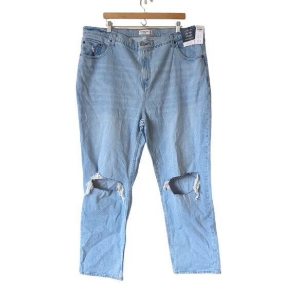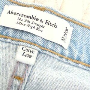 Abercrombie& Fitch the '90s straight ultra high-rise curve love size 36 22R brand new with tag retail $100 fitted top with full length straight leg featuring an additional 2 in through hip and thigh. purposely distressed knee light denim wash inseam 31 rise 14.5 flat across waistband 22.5. Brand new with tag!