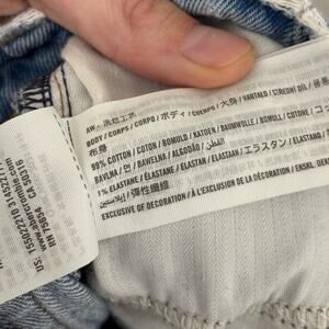 • medium light wash denim • distressed • regular length • 99% cotton / 1% elastane • good pre-owned condition, no flaws Measurements: 13.5” across waist 11” rise 30” inseam